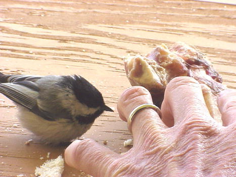 it. He simply flitters across my hand, and settles hock-deep into the breadcrumbs