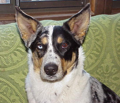 supper - deer steak, biscuits, green beans, and cherry pie. Dogs pretty filled up on mice. Gave 'em some frozen bones to chew on. Made note to order worm pills. One evening, not too long ago, the dogs and I were homeward bound when Bonnie took off like a gale of hen feathers into the willows next to the house. She pounced and sniffed through the dead grass, then proceeded on down into the dry irrigating ditch. Bo just ignored her little escapade and headed into the house to lay down by the fire. By the time I'd finished filling the wood box, Bonnie had returned and was innocently looking up at me with that soft, big, brown eye, and that shiny, big, blue eye. "Okay, get along on in there with Bo," I told her, motioning her through the door. Still, she waited, cocking her head as if to ask, "Are you really sure about that?" Well, about that time, the porch light shed knowledge on her tell"tail" secret. Though she was very closed-mouthed about it all, I could see a mouse's tail hanging out from between her front teeth, and it was still movin'. Dang it, Bonnie! Tryin' to sneak a mouse into the house! I just don't like when she does that. Tuesday, December 28 - Rudy and Son John worked on the new calving