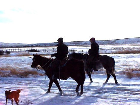 Wednesday, December 1 - Seems our entire county is excited about and making preparations for the upcoming wedding of one of our well-respected ranch neighbors and a lovely, little gal from Pinedale. Ever wonder why cowboys always get hitched when the work's all done in the fall or after the irrigating water is turned on in the springtime? The Cowboy Wedding Monday, December 6 - Merry Christmas, John Deere Tractor Company! I'll be purchasing $225 worth of merchandise from you, shortly... This week is as chilly, windy, and dismal as last week, and to top it off, some of the crew has been sick for the past few days. When this happens, we take turns shouldering each other's duties. So as the story goes and the winter's early darkness crept across the valley, 'twas I who fired up the John Deere tractor to finish the last chore of the day - fetching a round bale from the river hay pen for tomorrow's calf feed. No full moon tonight - can't see the cow's nose in front of my face. But, not a problem, I thought; this fancy tractor has running lights that'll set the night ablaze; pull a couple of switches here, a couple of knobs there, and we'll look like a Christmas tree that'll be seen clean across the county. I've been getting along fairly well with this new 4x4 tractor since I finished my brief, "correspondence" course via my "always-in-a-big-hurry" husband. I can now lift, tilt, bend, twist, and maneuver every accessory part in any direction imaginable - almost at will. I'm even getting pretty good at sneaking up on a bale of hay, running the grapple thingy through it, then loading the 1500-pound bale onto the wagon in the exact spot where it won't dump the whole load. Yip, me and that big, ol' tractor can do-si-do in and around the gates, corrals, electrical wires, and livestock pretty danged confidently. At least I thought so, until tonight. After the hay was loaded, I cautiously started to maneuver the tractor back under the shed where we bed 'er down each night. I was proud of myself, helping out and all, and now I was concentrating hard, trying not to ram the tractor loader into the salt pallets or the antique cement mixer on my right hand side. And I was being extra fussy not to scrape along the rough lumber walls with the mammoth tires on the left side. Yip, it was going to be a tight squeeze, but I was up for it. Suddenly, a shot heard round the ranch echoed from the dark shadows and crashed at my feet in a heap of tinkling glass. You guessed it! After I'd unhooked from the hay wagon, I'd left the tractor door open at an unhealthy angle, and when this big, ol' glass door met the shop's tall timbers, it underwent a challenge not anticipated by the John Deere design team. Close the door! Close the door! Close that danged door! The memory of Rudy's repeated orders banged at my numb skull like a sledge hammer, and my heart and my throat lay on the ground amongst the pieces of shattered safety glass. Safety glass, my rear end! Anyhow, Merry Christmas John Deere, and God speed the UPS! I weaned eight-month old Sunny this morning. I put Pony in with him for company, but he didn't even notice that the mare was gone until a whole day had passed. Then the pitiful little colt set up a commotion and so did his mom - nickering and running along the corral fence. I know how the mare must feel. A few years ago, they weaned me from my son when he went off to college clear across the high, wide, and lonesome State of Wyoming. Tuesday, December 7 - We started feeding the herd bulls in the big meadow. The older bulls are looking slick and fat, but the younger two and three-year olds are starting to fall off on their weight a little bit. Therefore, we decided it was time to throw out a partial feed and let 'em rustle through the fall grass for the rest of their daily grub. We feed extra salt and mineral supplements and make sure they have plenty of water. Critters can survive extreme weather if these needs are met each day. Wednesday, December 8 - The dogs are usually pretty quiet, but last night they barked on and off all night long. The moose are starting to roam through the willows, and those danged coyotes are yipping and ki-yi-ing just a short ways from our bedroom window. They have a habit of teasin' the dogs in that sneaky coyote way that always stirs 'em up. Coyotes have a unique style of barking when they're feeling mischievous - you can hear it in the pattern of their bark. They'll tip their heads back, loosen up their vocal cords, and make your dog think he's missing out on all the fun. You betcha, just like sailors listening to the sirens at sea, this coyote choir is really talented at luring a dog into their wild domain. Then, slick as a whistle, they'll take great pleasure in killing your favorite hound. Many times over the years, we've been riding along on horseback with the dogs following along on our heels, just as a good cowdog oughta do. Suddenly, as if from nowhere, a lone coyote will fall in behind or to the side of us, keeping pace, taunting and coaxing at the dogs, and trying to draw them away from us. If you let a coyote have his way, the minute he and your dog disappear from sight, several more coyotes will surely join this single trickster and promptly and efficiently rip your ol' dog to bits. Our neighbors once had their dog attacked by coyotes in this exact manner. The pack chewed and ripped at her and left the little ragged carcass for dead in a willow patch. My friends looked high and low for the little female pet, but could not find her. Then a couple of days later, Muffin dragged herself onto their front porch. The tough little "gal" had survived the attack, but barely, and is still alive today to remember the story. Most dogs, however, aren't so lucky. I once read about a 20-year study explaining how coyotes are territorial and will spend their entire life cycle living in and protecting one area, unless they're forced out. The writing suggested that if you aren't having an