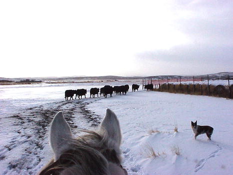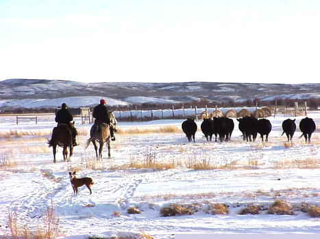 season. Also turned out on pasture with them, were our heifers (coming two-year olds that will have their first calf this spring). After we got the cattle home, we sorted the older gals away from the heifers, then drove the matronly bunch through the blowin', driftin' snow to a nearby swamp pasture. With a diet of frozen, wild grass and mineral and salt supplements, they will maintain their sleek, fat condition for two to three more weeks or until Old Man Winter gets serious about his job. At that time, we'll start rolling a full feed of hay to 'em. As for the young ladies, we started them on a complete ration of everything we could get our hands on, because their still-growing bodies and unborn calves need lots of TLC. Sunday, December 19 - We pushed the main herd from Horse Creek